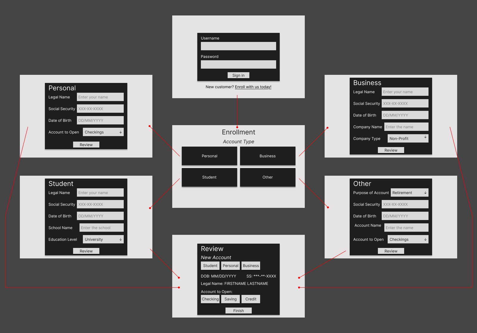 Next, I wireframed the user experience, keenly considering who would use an ATM and how people use them. With this in mind, I created two separate paths, one for returning customers and another for new customers, and built their menus around what I and others use an ATM for. Once the wireframes were streamlined, I produced high-fidelity mockups with the interactivity and direction required for a seamless kiosk experience.