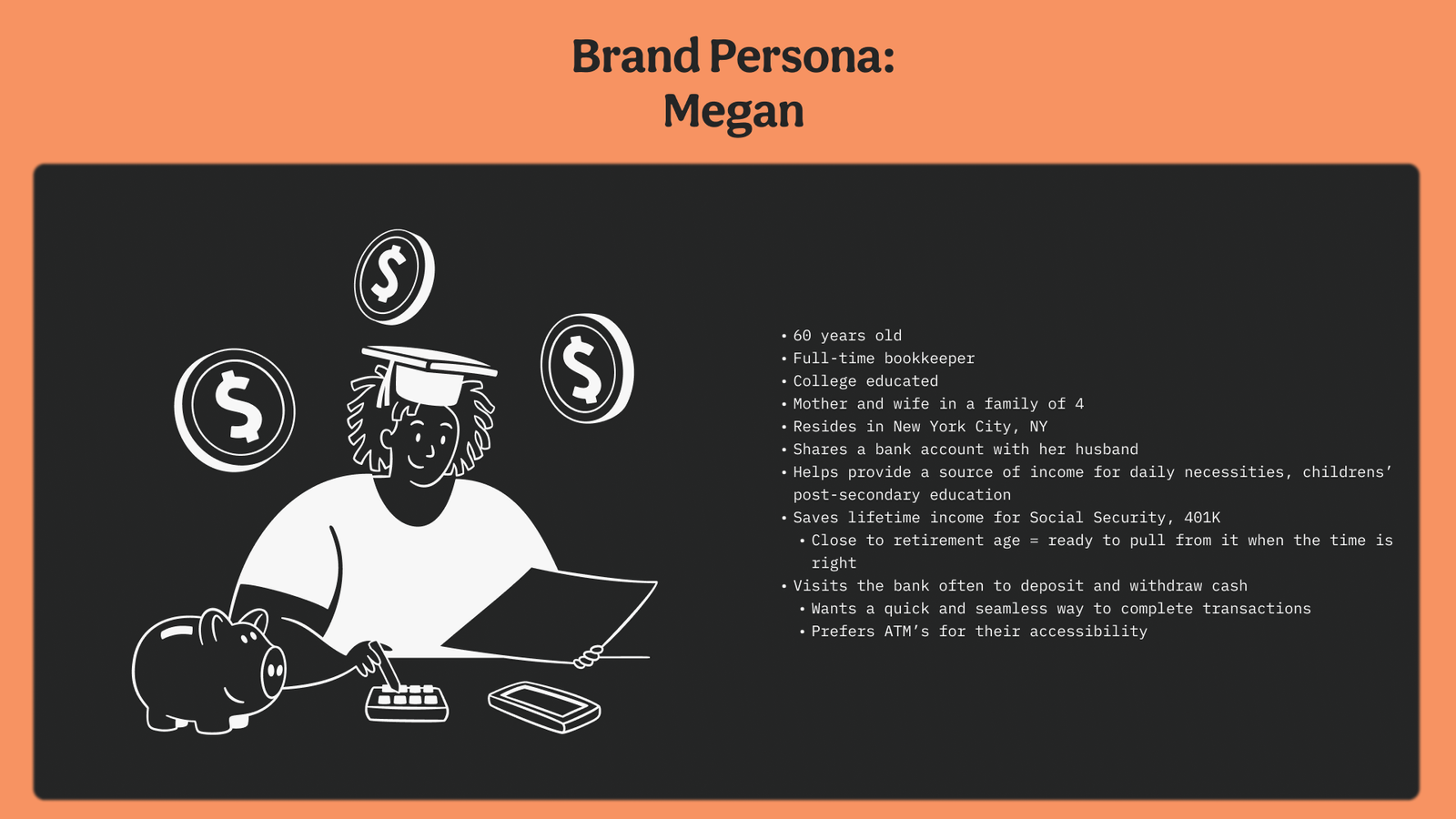 Building a brand and a kiosk revolving around monetary value led me to the man on the penny, Abraham Lincoln. This decision was intentional, showing how even small monetary gains can lead to bigger and better things. Thus, Lincoln’s brand identity implements a colorful yet trustworthy voice in an often stiff and formal industry, prioritizing a user’s needs and what they dislike about using ATMs and kiosks.